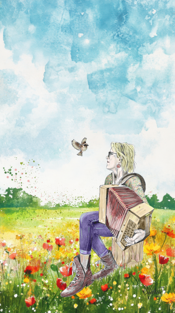 Artiste engagée et passionnée par la voix, le chant, le piano, l’accordéon et la transmission orale, elle s’inspire de ses nombreuses expériences professionnelles et personnelles mettant au cœur, l’humain et le partage.